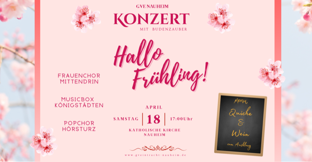 Starten sie mit dem Gesangverein Eintracht Nauheim in den Frühling! Samstag 18. April 2026 ab 17 Uhr Budenzauber mit Konzert "Hallo Frühling" katholische Kirche Nauheim. ![]() Sonntag 19. April 2026, 17:00 Uhr bis 18:30 Uhr Benefizkonzert zugunsten der Hospizstiftung GG "Vereinte Stimmen-Starke Hilfe"Stadtkirche Groß Gerau Weihnachtskonzert mit Budenzauber -Voller Erfolg!